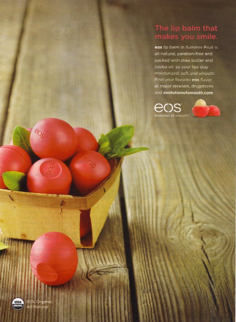 I love this print ad from EOS. The packaging ties in perfectly with the brand’s organic image and the color pops off the page. The copy is good but I’m not excited by the headline. If I was writing the copy for this ad, I would have used the following headline instead: Don’t be afraid to crack a smile. This headline flows nicely into the copy that follows which lets the consumer know why this product will help to erase the fear of smiling when your lips are dry.